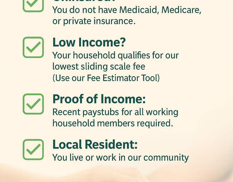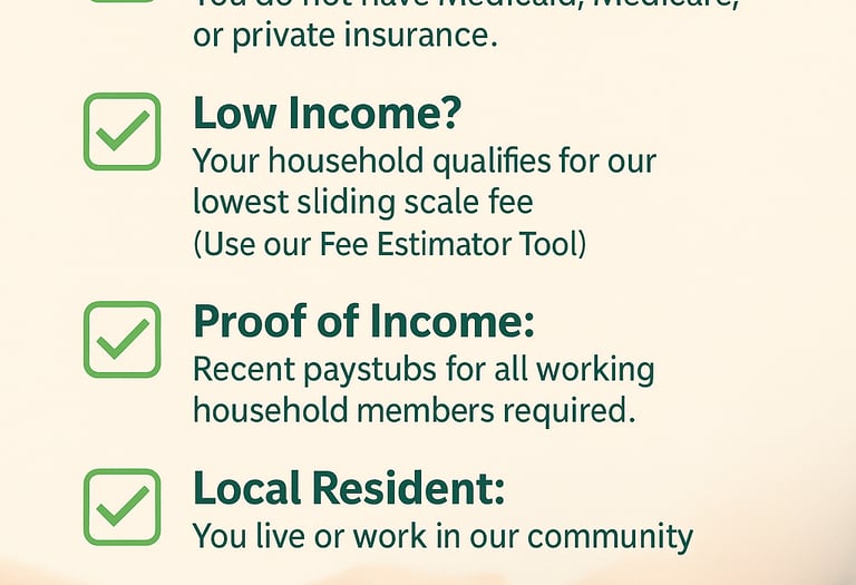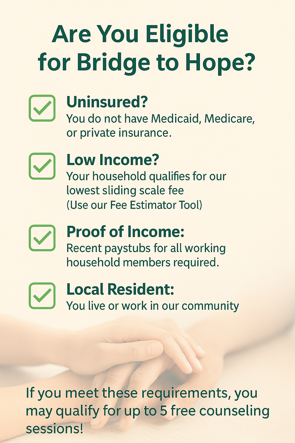 To qualify for Bridge to Hope, applicants must be uninsured, meet our sliding scale income guidelines, provide recent pay stubs for all working household members, and live or work in our community. These criteria help ensure that our program serves those with the greatest financial need who may otherwise go without counseling services.